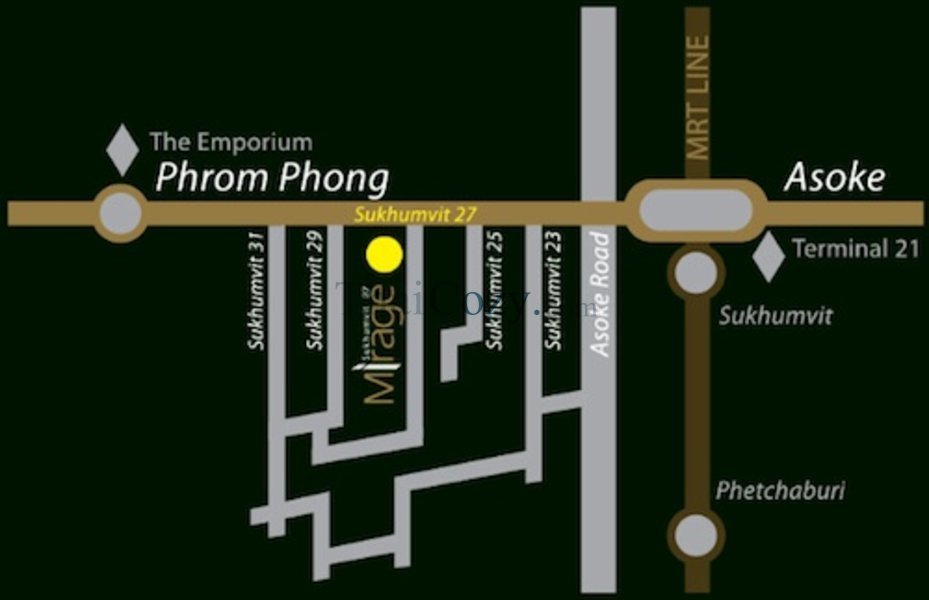 สถานีรถไฟฟ้าที่ใกล้โครงการสถานีรถไฟฟ้าที่ใกล้ มิราจ สุขุมวิท 27 มากที่สุด คือ บีทีเอส สถานี อโศก ซึ่งห่างจากตัวโครงการเพียง 0.57 กม. หรือใช้เวลาราว 7 นาที สำหรับการเดินไปยังสถานี